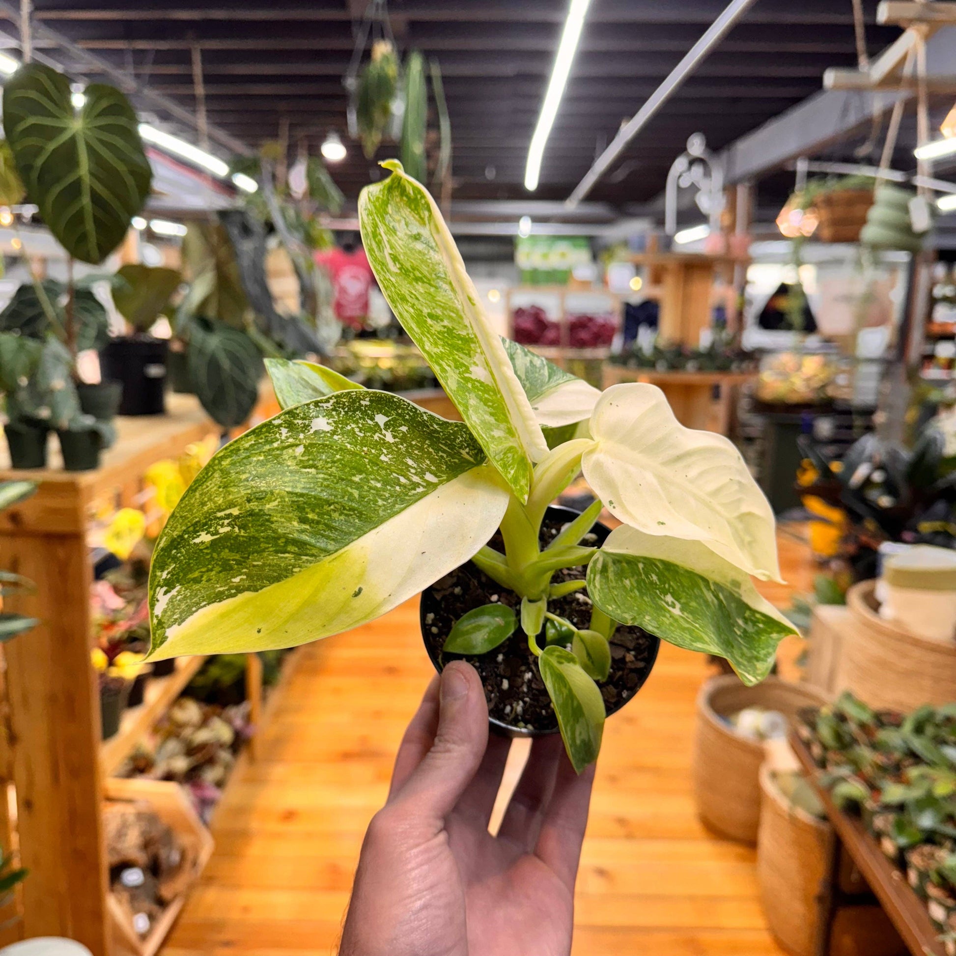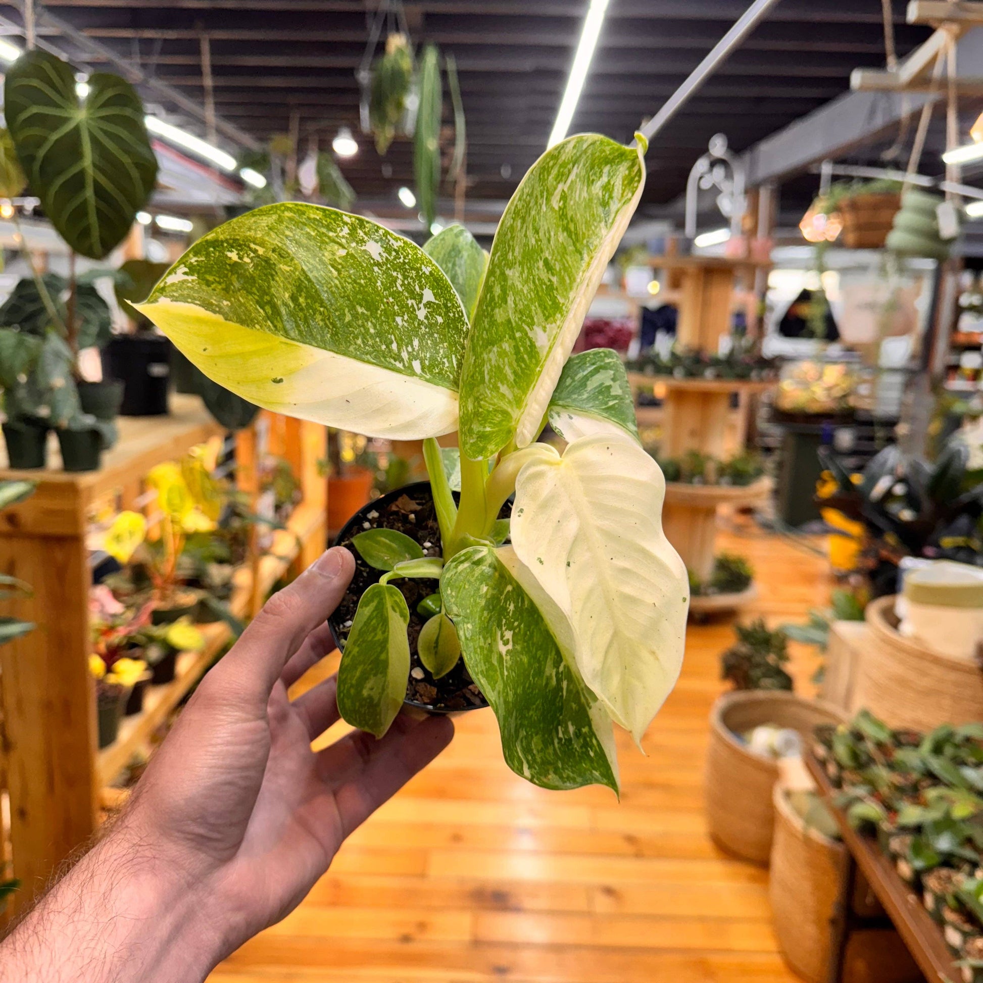 Philodendron 'Jose Buono Fiesta' is a rare and show-stopping variegated cultivar known for its large, paddle-shaped leaves splashed with vibrant shades of creamy white, lime green, and deep forest green. Each leaf is uniquely marbled, with dramatic swirls and splotches that make this plant a true collector’s piece. With a climbing growth habit, it thrives on a moss pole and prefers bright, indirect light to maintain its bold variegation.